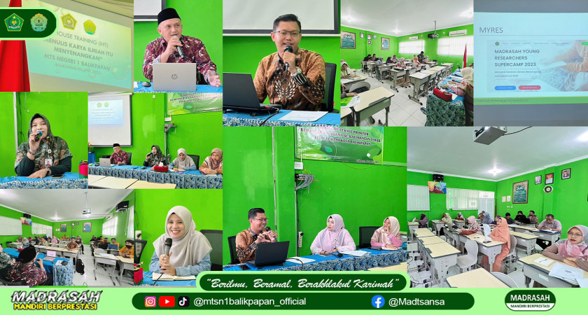 In House Training Persiapan mengikuti Madrasah Young Researcher (MYRES) Kementerian Agama diadakan di MTs Negeri 1 Balikpapan, Kamis, 6/4/2023 pada bidang Kegamaan dan Sosial-Humaniora. Kegiatan ini terbagi menjadi dua sesi yang berlangsung di ruang multimedia dengan 38 peserta sebagai pembimbing dan siswanya. “Menulis Karya Ilmiah itu menyenangkan” menjadi judul materi IHT pada sesi pertama adalah Dr. Muhammad Salehudin, M.Pd. selaku dosen pasca sarjana UINSI Samarinda.